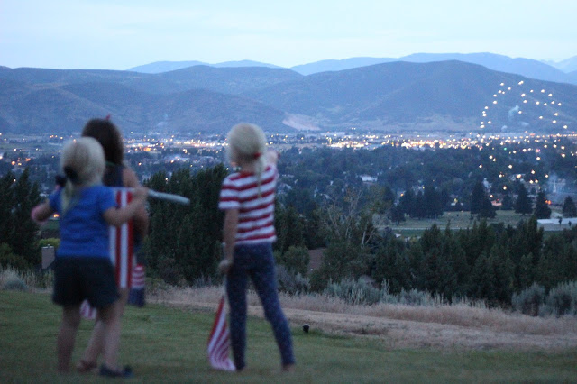 Then we headed to my parents house for the 4th of July. Amy's family also met us there. Grandma Anderson made a huge party just for us. With festive decorations and delicious food and even 4th of July crafts. We ate dinner, played outside. All the cousins play well together. I had brought 100 or so glow sticks. The kids made them into necklaces and then went downstairs in the theater room where it was dark and had a huge dance party to the music from the new ANNIE. We called it a toddler rave. They loved it. Grandma Anderson made a big firework show for us while we sat on the grass. Then we did sparklers. Marianne had to be convinced they were safe, but even Beth loved them. After that we went to the front of the house where we watched the entire valley set off their fireworks. It is the best place to have the fourth of July. Hundreds of fireworks can be seen in every directions. The children ran around the grass watching them all and kept hugging me telling me it was the best day of their life.